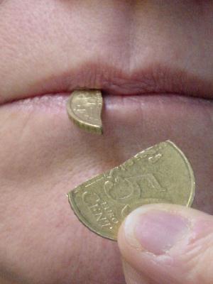 Der Zauberkünstler beisst von einer Fünfzig Cent Münze ein Stück ab und zeigt das abgebissene Stück...